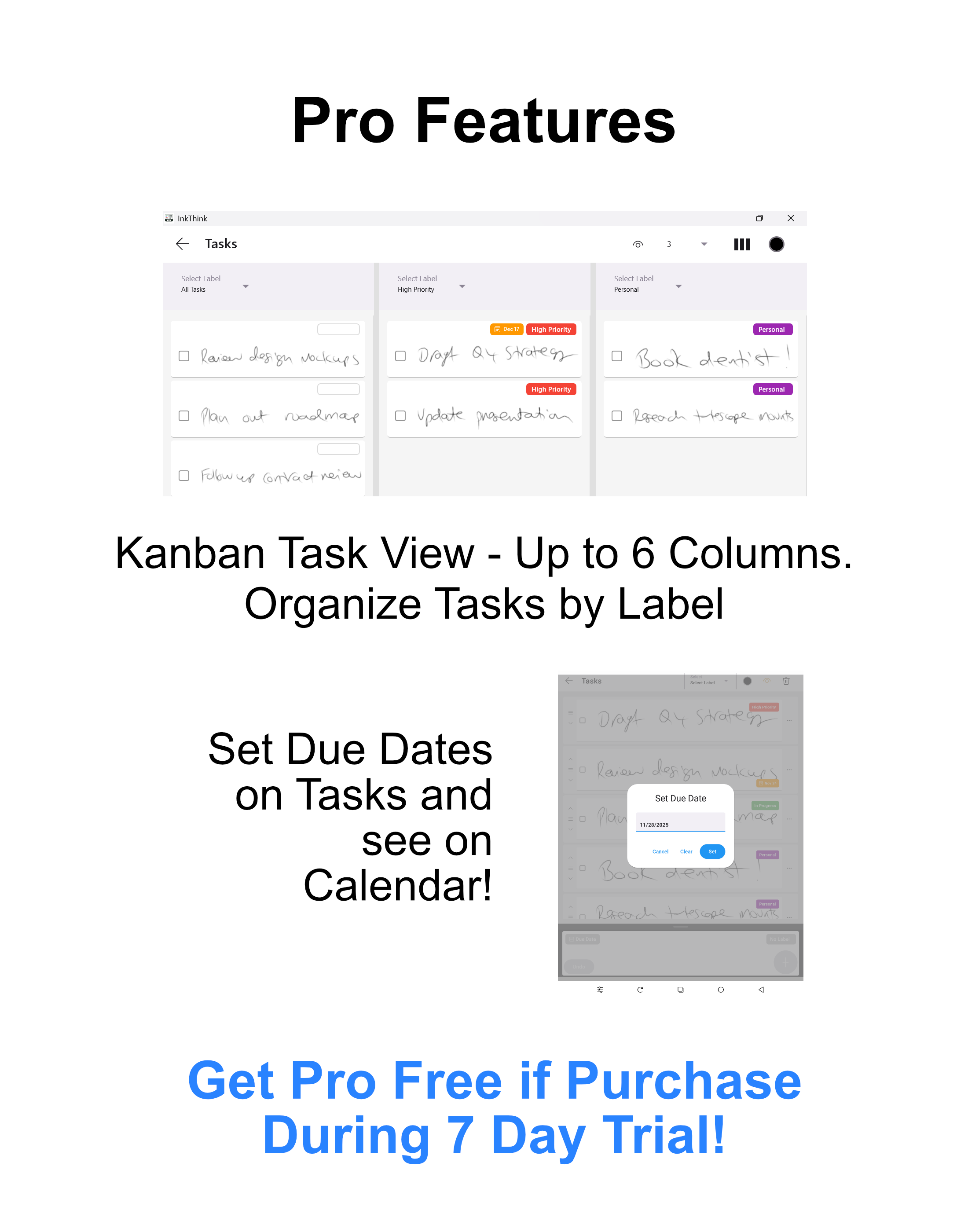 A quantum leap over traditional 'Pen Planner' apps. Featuring unique intelligent ink where calendar entries dynamically flow across your Calendar views - no longer just simply inking over a PDF and not showing on other views. Your handwritten calendar entries reflow and show in all your different Calendar views - depending on which view you are in - day, week, month. What you have been expecting and waiting for from an intelligent pen stylus ink based diary app!