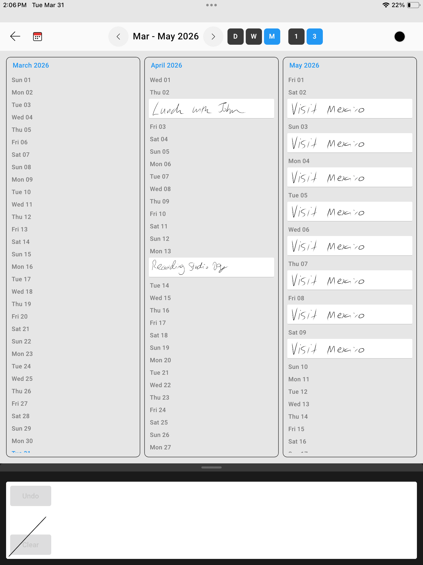 With Pro you can view 3 days, weeks or months. In Portrait mode we render 3 columns for Month view, and in Landscape view we'll render a full calendar grid with your inked events!