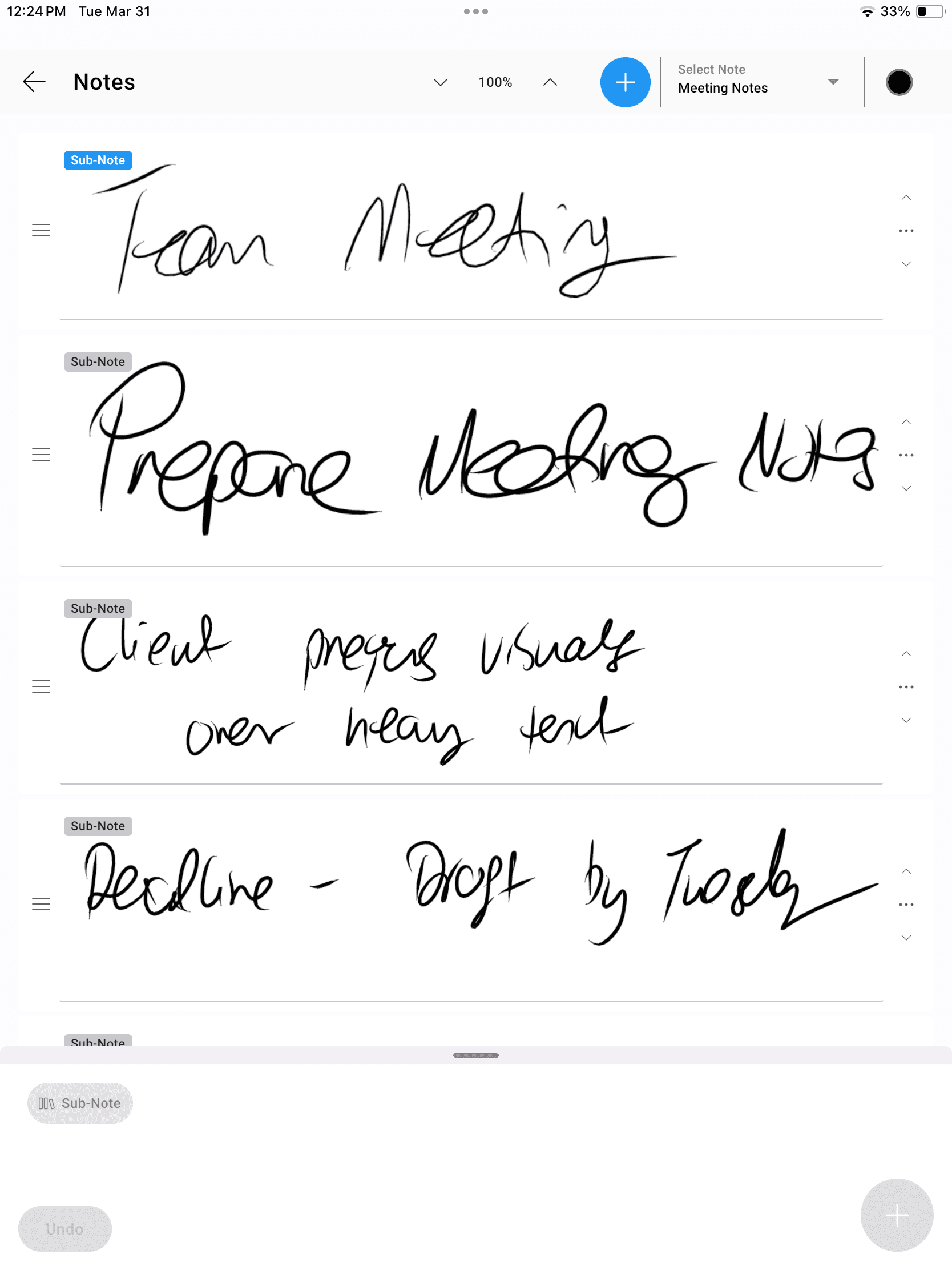 Capture notes and ideas while you listen, watch or meet. Each note can include sub-notes for an extra level of organisation.