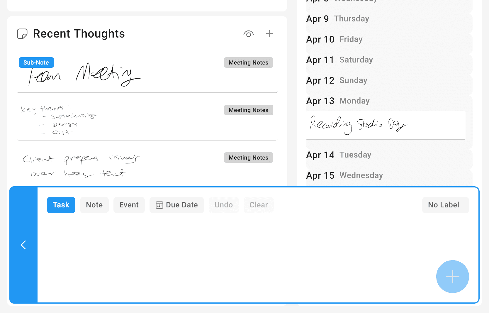 Quickly add a Task, Note or Calendar item from the Home Screen — your fastest path from thought to captured idea.