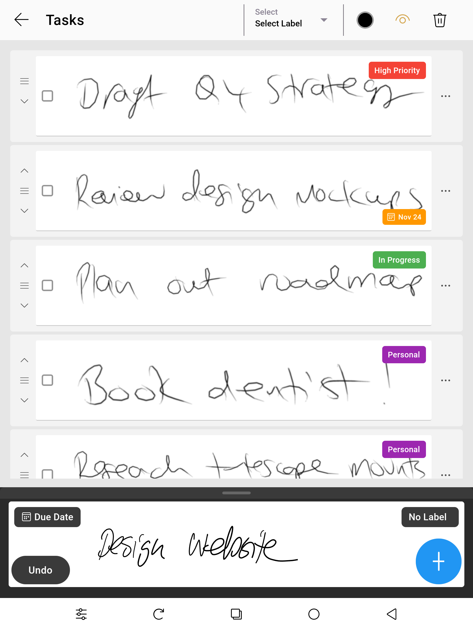 A scrollable, re-orderable handwritten task list - just like the real thing ;-) Sketch your to-do's. Rearrange with a flick!